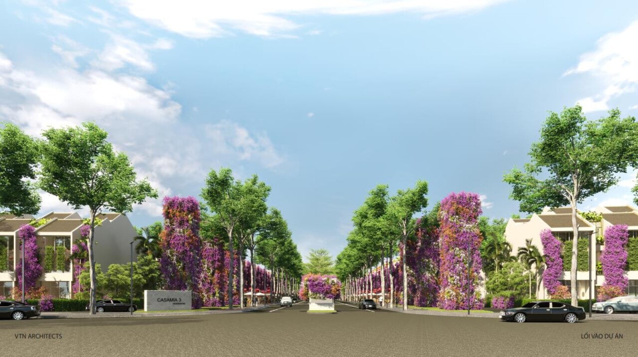 Cổng chào được trồng 6 trụ hoa giấy cao 12m, quanh năm rực rỡ tạo cảm giác nhộn nhịp, sầm uất ngay khi bước chân vào dự án